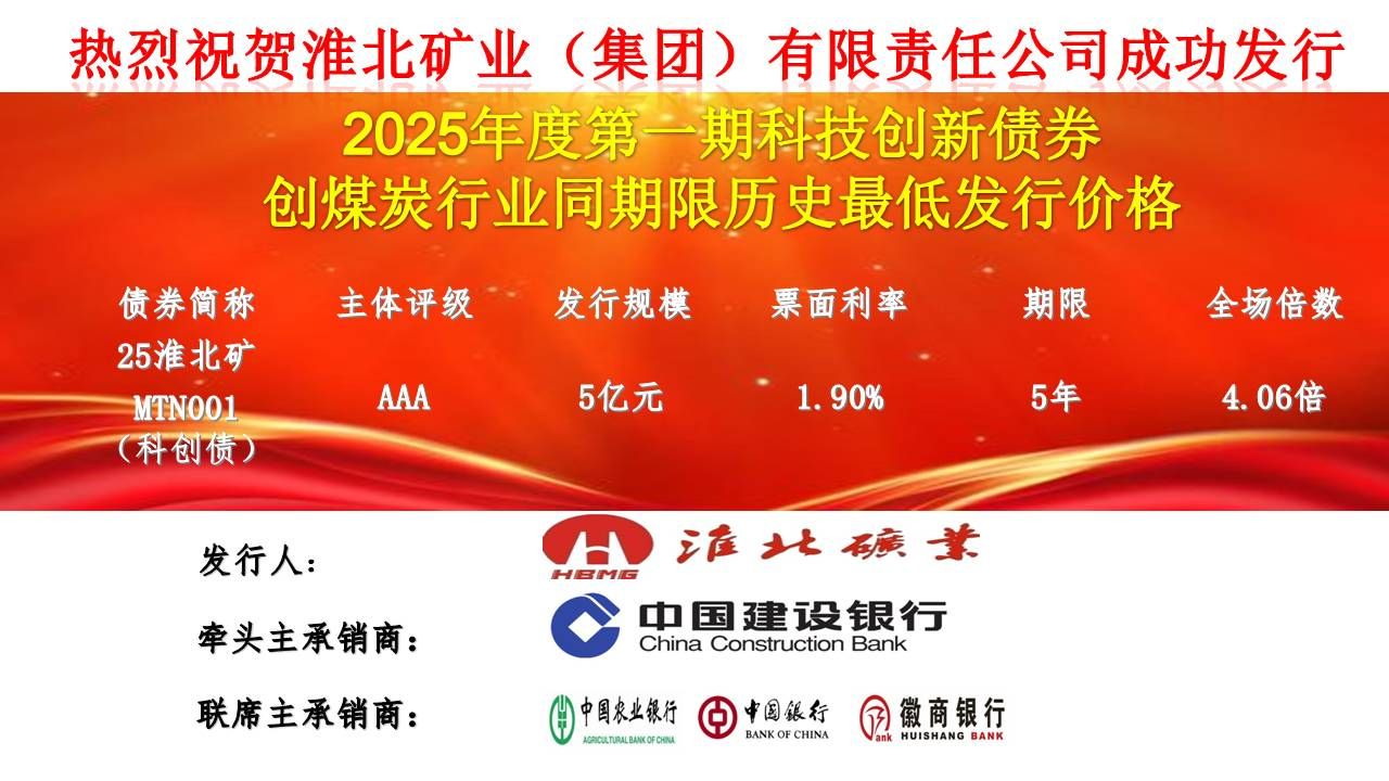 2025年7月8日,淮北礦業(yè)集團在銀行間市場成功發(fā)行2025年第一期科技創(chuàng)新債券——25淮北礦MTN001(科創(chuàng)債),發(fā)行規(guī)模5億元,期限5年,票面利率1.90%,全場認(rèn)購倍數(shù)4.06倍,創(chuàng)煤炭行業(yè)同期限債券價格最低、集團債券票面利率新低,充分顯示資本市場對淮北礦業(yè)集團科技創(chuàng)新實力和高質(zhì)量發(fā)展前景的堅定信心。