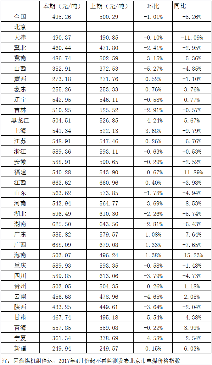 2019年5月15日,國(guó)家發(fā)展改革委價(jià)格監(jiān)測(cè)中心公布4月中國(guó)電煤價(jià)格指數(shù)為495.26元/噸,環(huán)比下行1.01%,同比下降5.26%。其中,監(jiān)測(cè)的31個(gè)省市(不含北京市)中,價(jià)格下行地區(qū)數(shù)量有22個(gè),下行幅度減弱至27.44元/噸以?xún)?nèi);其他9個(gè)地區(qū)電煤價(jià)格全部上行,漲幅上行至19.21元/噸以?xún)?nèi)。本月全國(guó)煤炭?jī)r(jià)格活動(dòng)范圍整體上移,且煤炭?jī)r(jià)格上下行地區(qū)數(shù)量比例基本維持,說(shuō)明價(jià)格下行區(qū)域活力減弱,而上行幅度擴(kuò)大。
